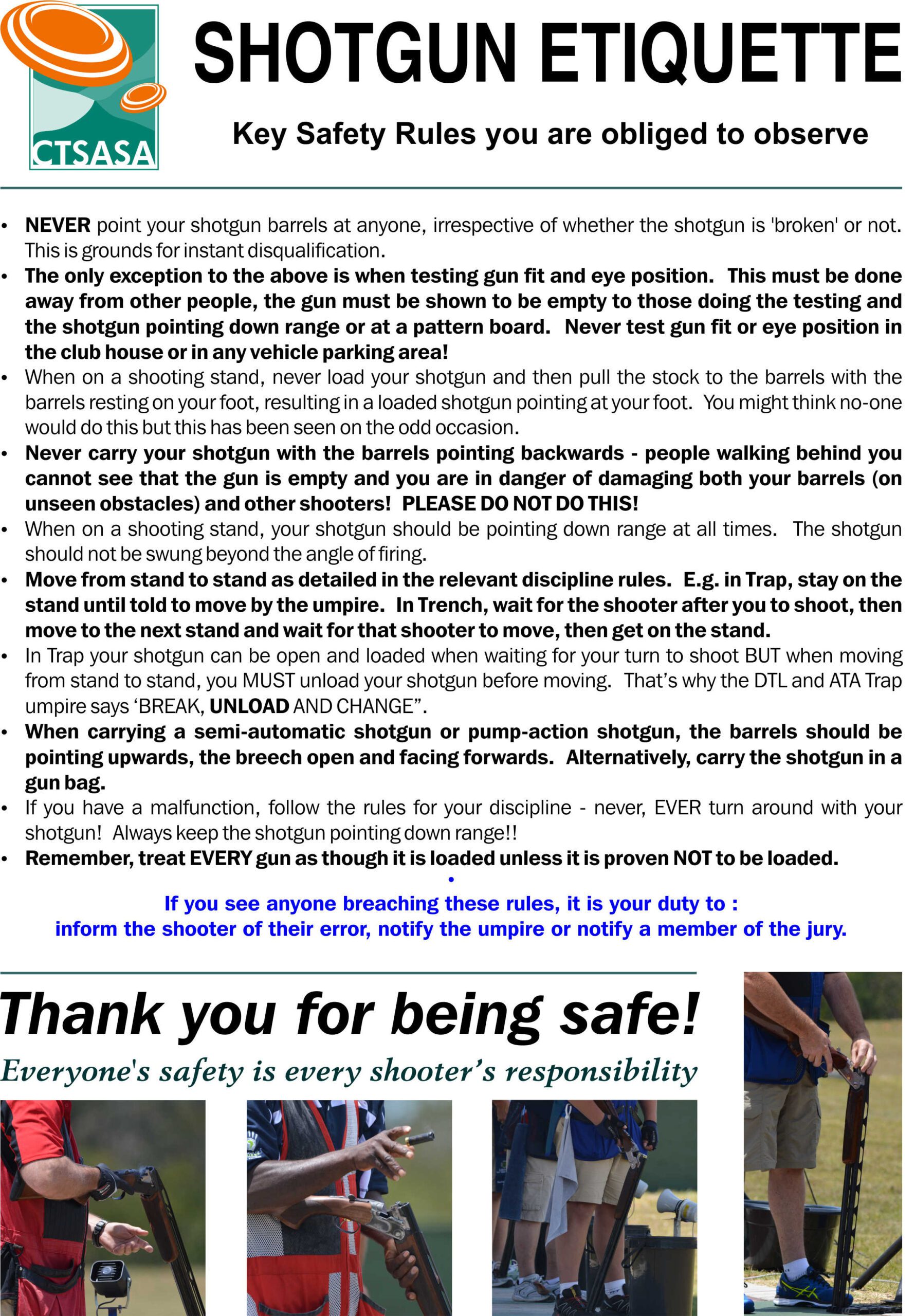 - NEVER point your shotgun barrels at anyone, irrespective of whether the shotgun is ‘broken’ or not. This is grounds for instant disqualification.
